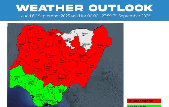 Hukumar Hasashen Yanayi ta Ƙasa (NiMet) ta fitar da hasashen cewa ruwan sama mai ɗauke da guguwa zai ratsa sassa daban-daban na Najeriya a ranar Lahadi, 7 ga Satumba, 2025.